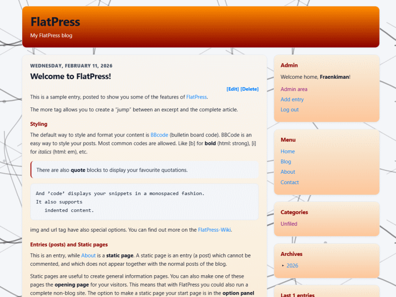 Statické stránky jsou užitečné při vytváření stránek s obecnými informacemi. Jednu z těchto stránek můžete také nastavit jako úvodní stránku pro své návštěvníky. To znamená, že s FlatPress můžete provozovat také web, který není blogem. Možnost vytvořit ze své statické stránky úvodní stránku je v panelu možností v oblasti administrace webu.